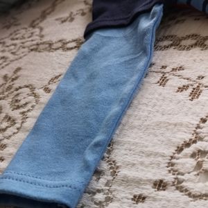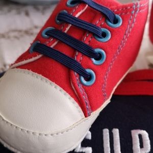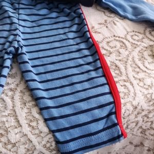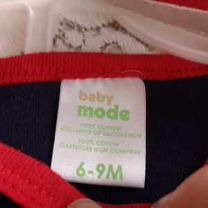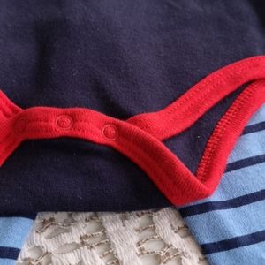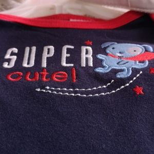 New with tags and original hanger, this blue and red set has a long sleeve onesie with a puppy graphic that reads Super Cute Sleeve has dark blue and light blue sections and is trimmed in red. Matching stripped blue pants with red trim down leg and matching red shoes with blue laces complete this brand new set. An adorable baby gift.
