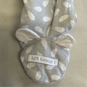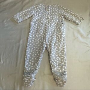 Charming gray insulated onesie sleeper with a white leaf design. Features a cute bow detail. Ideal for a stylish baby outfit. Silver features along the cuffs and shoulders.
