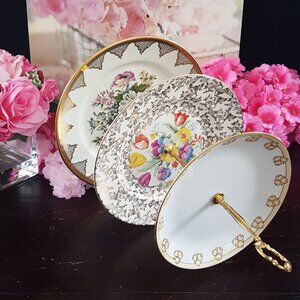 Top tier is a hand-painted (France) porcelain dessert plate with gold edge