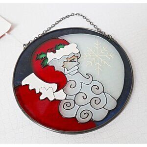 3 Vintage Christmas Suncatchers Reverse Painting on Glass Santa Poinsettias Blue
