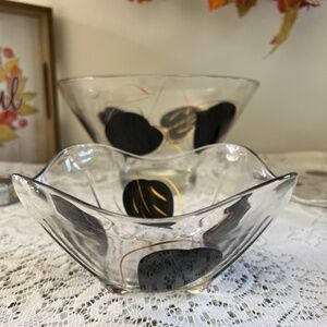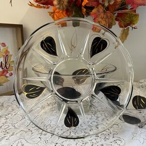 Beautiful MCM 1960's black and gold on glass!! In excellent condition with hand painted black leaves and gold leaf with very few fades. No chips or cracks. Set includes: a large 'chip' bowl that measures 10.5 inches in diameter and stands 6 inches tall; scalloped square side serving 'dip' bowl that measures 6.6 inches across and stands 3.5 inches tall and dips down with scalloped edge to 2.75 inches; rare and hard to find round serving plate that measures 11 inches in diameter. All from a smoke free home.