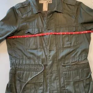 Joe Fresh olive green jacket front zipper as well as buttons at the cuff and shoulders drawstring waist generously sized size small see measurements in photos ๐