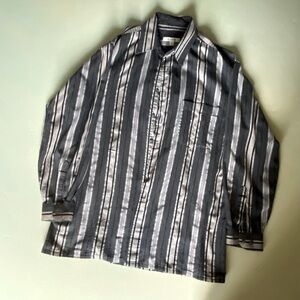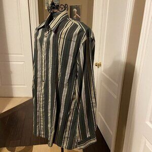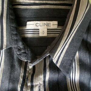 This shirt is cotton and feels like silk blend. It is in good used condition. The fabric is soft and doesn't wrinkle but has a really nice drape to it.