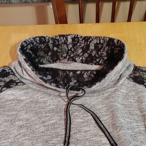 super comfy grey pullover. This sweater has lace detail on the shoulders, sides and around neckline. Grey in colour and size small armpit to armpit measures approx 19". fits more like a medium but is sized from store as a small.