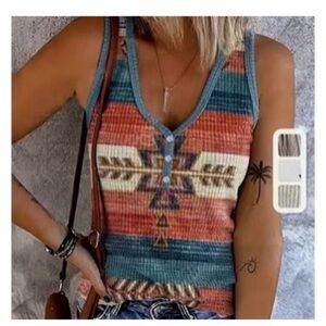 Embrace vibrant style with this Aztec print sleeveless top. Featuring a mix of red, blue, and cream colors, this top is perfect for casual outings. Enjoy comfort and fashion in one piece.