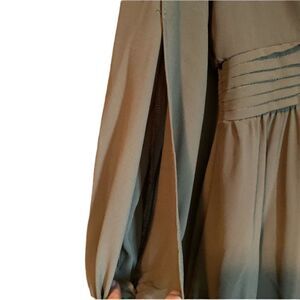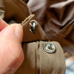 Beautiful dress. One of the buttons on the cuffs is staring to become detached (refer to photos). Not noticeable when it’s all buttoned up. I love the deep v neck on both sides and the slits on the sleeves.
