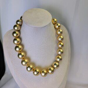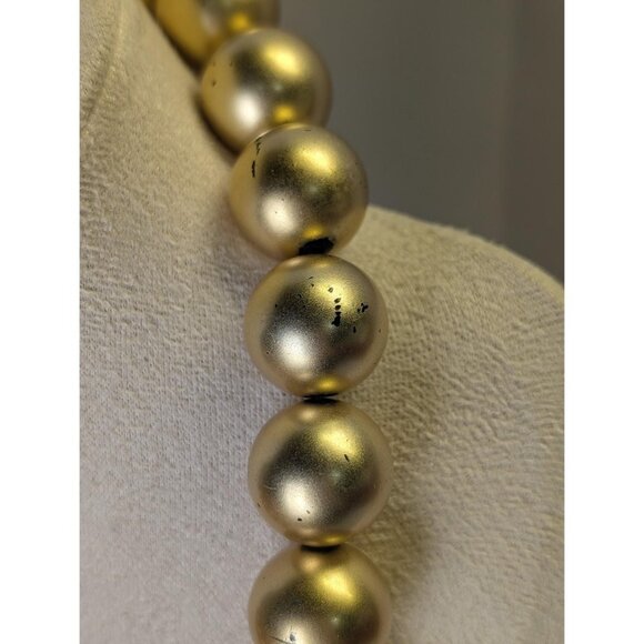 this necklace has gold beads with splatters of dark over them, I'm nor sure if that's intentional or from wear but it looks real cool in person, sold as is with this in mind