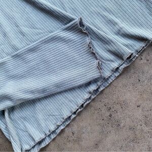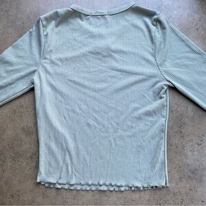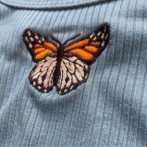 features: stretchy ribbed fabric. Beautiful sage green colour. Ruffled lettuce hem on sleeves and bottom hem. Scoop neck. Embroidered monarch butterfly at neckline. No care tag.