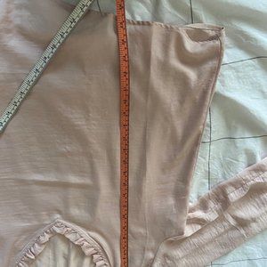 Beautiful light pink gathered shoulder sleeve seam, ruffle neck top. Wrists have elastic. Polyester. Size L EUC. Dress it up with jewellery or dress it down with jeans. A really beautiful top for any wardrobe.