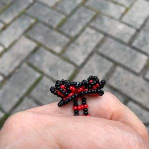Handmade, Beaded 5 Petal Red & Black Flower Ring, Fits up to Ring Size 8, Glass Seed Beads, Flower is 1in/2.5cm in Diameter