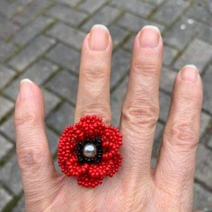 Handmade, Red 5 Petal Beaded Poppy Flower Ring, Fits Up To Ring Size 8, Glass Seed Beads