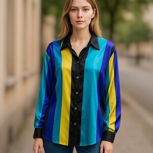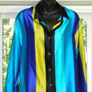 Details: This listing is for a pre-loved Vintage Multi-Colored Striped 100% Silk Blouse by “Linda Allard Ellen Tracey” in a size 12 Petite and is a full 6 button up front shirt with a black collar and small shoulder pads. This blouse is dry clean only blouse.