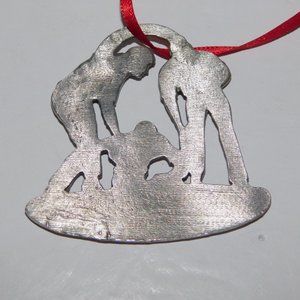 This hard to find 3 Men Curling Pewter Christmas Tree Ornament 2" x 2" is in great clean Condition