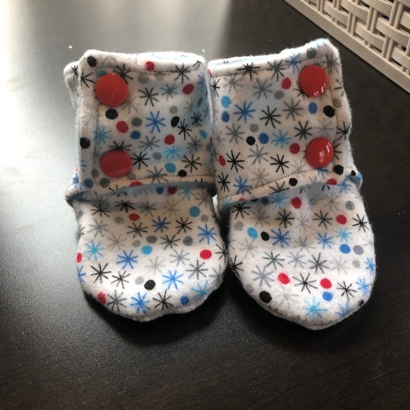 3 month baby bootie flanelette outer and blue soft fleece inner. Snap closure and elastic inner to keep on feet. Grip material on sole of foot