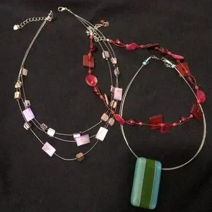 3 necklaces, one red, one purple mother of pearl kind of look and one blue-green