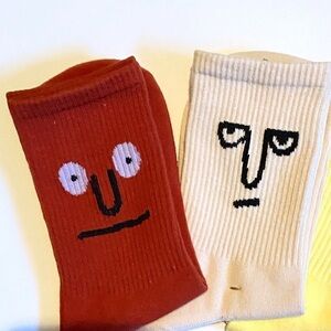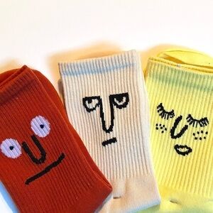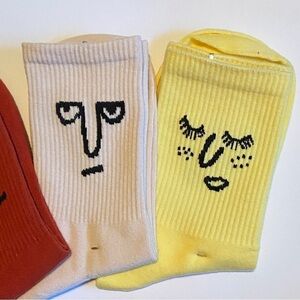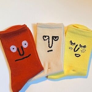 3 pair New cream, burgundy, yellow. Cute cartoon expression face tube socks. Street style skater, would look great with sneakers or pair of chucks. Adult size probably best for small/ med feet.