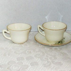Saucers measure just under 6" in diameter, cups 2 1/2" tall.