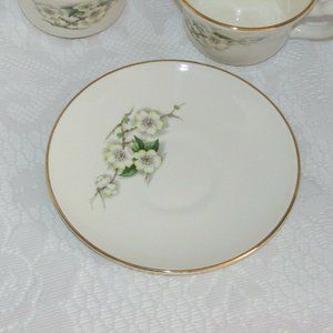Three pieces with a charming floral pattern. Spring Blossom by Georgian China, U.S.A. - White flowers on branches, smooth 22 KT gold rim.