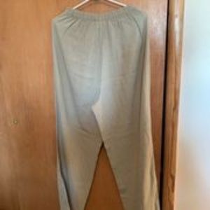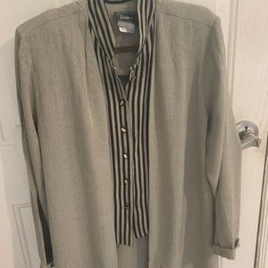 Very sharp stripe detail and mix with 24.5” skirt or pants option. Nice neutral tone with black contrast in all in one jacket. Inner button top has look of shirt but attached sits a little shorter with nice length jacket overlay. Canadian made. Very striking suit.