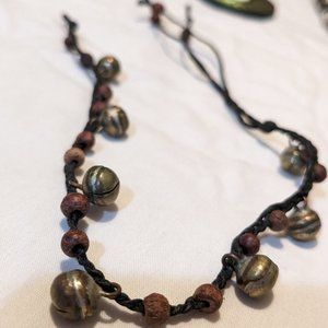 Lucky jingle adjustable ankle bracelet, Nepalese bells and wooden beads on waxed cotton chord