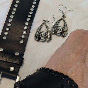Heavy metal earrings 2 adjustable black leather wrist cuffs