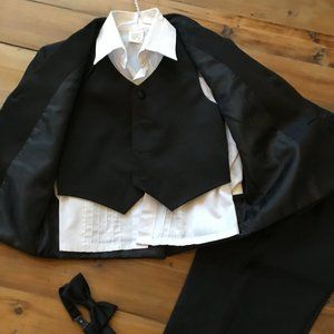 This three-piece tux includes jacket, pants, vest, white tuxedo shirt and adjustable bow tie.