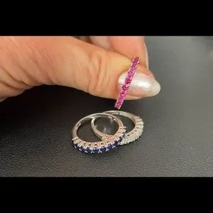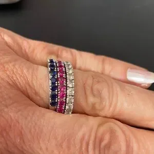 I love this trio. Each ring has 11 stones on each band and the number 11 is a master vibration number in numerology. One ring is sapphire, one ring ruby, and one ring diamond. ( NOT SURE IF THEY ARE REAL! ) The band is silver. If you ever see number 11 in your every day life or wear it, you should pay more attention to your thoughts and ideas and be more optimistic. Your angels will help you achieve your goals, but you have to practice positive affirmations. It is also important to have faith in yourself and your abilities. I love jewelry that remind us to be happy with where we are in life!