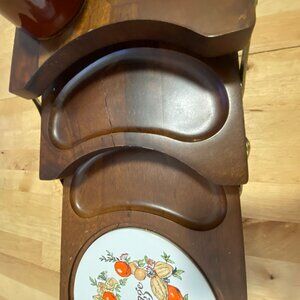 This equisite vintage 70's serving buffet is ready to host the next upcoming fondue party. Drenching in 70s style is the classic dark brown wood and autum pallet ceramic cheesey board goodness. This piece is a must for the hostess with the mostess. Makes a great gift for a wedding, divorce or birthday. Collector condition.