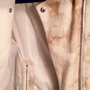 This cream leather jacket and matching shorts by 3.1 Phillip Lim exudes sophistication with its sleek, cropped design and elegant stand-up collar. Crafted from high-quality leather, it offers a luxurious feel and a subtle sheen that enhances its refined appearance. Perfect for adding a touch of elegance to any ensemble, this jacket is a timeless addition to your wardrobe.