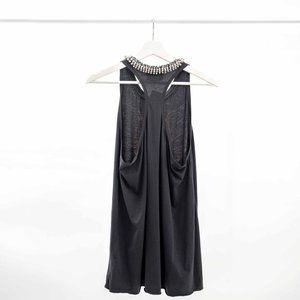 This charcoal racerback cotton tank is nothing short of cool. The edgy vibe is further elevated with an amazing bejeweled neckline of crystals. The faded phoenix in the middle adds that extra rock and roll touch.