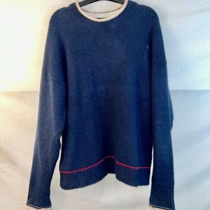 The blue with white and red accents is a funky addition to any outfit. Slightly shrunken/cropped fit. Reminiscent of a cozy vintage knit your granny might've made you as a child.