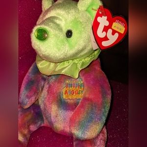 this cute lil guy is the august Birthday Beanie baby bear, he has a plastic "peridot" nose for the birthstone and he's so cute. A happy lil birthday clown boy!!