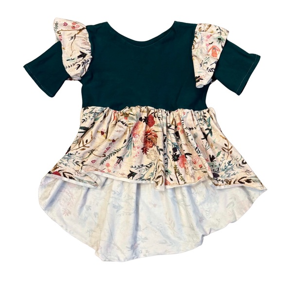 Charming dress with floral ruffle sleeves. Features a green top and floral skirt.