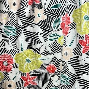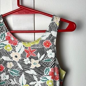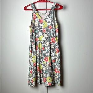 Charming sleeveless dress with a vibrant floral pattern. Features red, yellow, and green flowers on a white background. Easy to wear and easy to clean, in good preloved condition and lots of wear left. Marked kids L, size 10-12.
