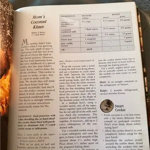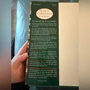 Rose's Christmas Cookies book. Includes a variety of different cookie recipes. Many pictures throughout. Very good condition. One eraser mark (see picture on coconut macaroons) and some minor water marks on early pages (wavy pages in the corner (see picture).