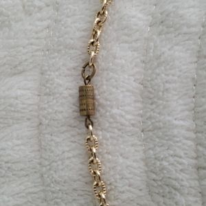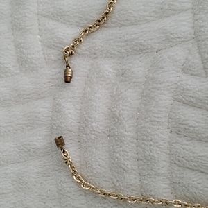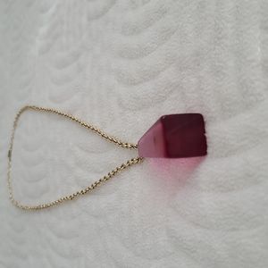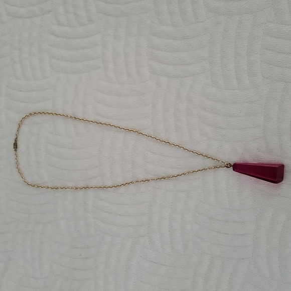 Statement necklace, gold colored chain with pink crystal like medallion, very good pre-owned condition.
