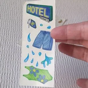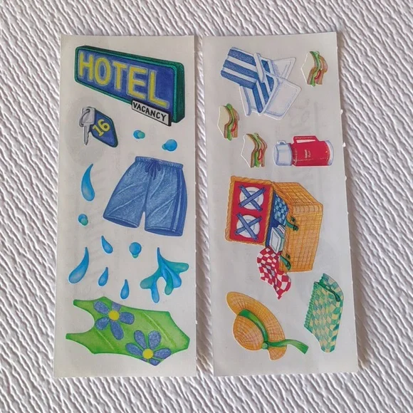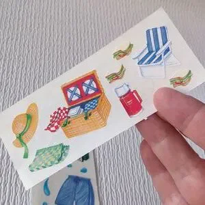 Vibrant summer-themed stickers featuring beach items and picnic essentials. Perfect for decorating notebooks or scrapbooks.