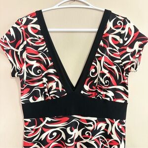 3/$10⚡️Vintage Y2K Black White & Red Swirl Dress w Cap Sleeve & Deep V-Neck