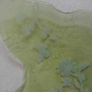 Green glass plate. Shape of a butterfly with white floral design. Measurements: 6" x 6".