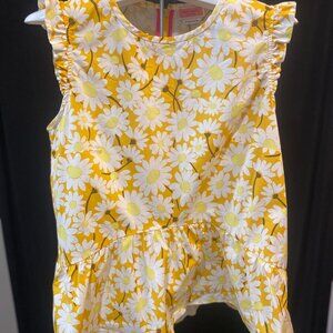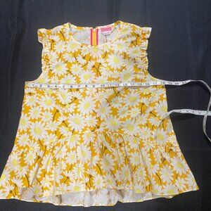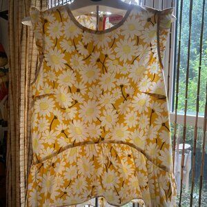 This feminine daisy print top flaunts a flounced hem and ruffle-trimmed shoulders for a chic look. Round neck Sleeveless Center back zipper 97% Cotton/3% elastane. To the festival or at work this adorable buttercup yellow daisy will brighten anyones day.