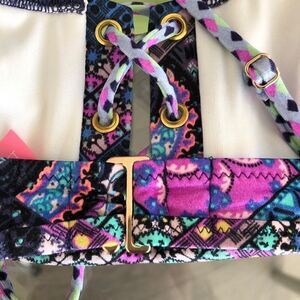 New without rage Victoria’s Secret lace up bikini top. Features gold hardware and beading with fun paisley patter throughout. Size small.