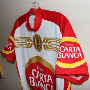 Vintage CERVEZA CARTA BLANCA CAGUAMA ¾ zip cycling jersey. Manufactured by World Jerseys in men's size XL as it says on the size label print. I measured 22" from armpit to armpit across the chest at the widest part and 28" from top of shoulder to back hem. Made in Mexico original. Scarce vintage original, long since sold out.