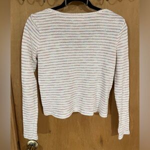 lightweight knit with a white base and horizontal stripes in various pastel colors, including pink, blue, and yellow. The sweater has a slightly cropped length and a relaxed fit