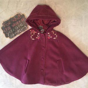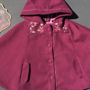 This burgundy riding hood cape with hood by Tahari is brand new without tags. Embroidered flower embellishment around the collar accessorizes this cloak beautifully. The through pockets are reminiscent of the vintage 60’s apparel. This size 4t cloak is lined. A great addition to the little one’s wardrobe. Multi-season wear. Easy to put on and take off. Stylish and trendy. Sunday brunch or on the way to Grandma's house this adorable and cozy cloak is fantastic.