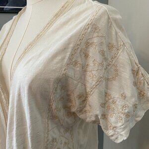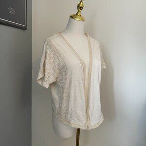 Details: Lightweight, flowy, short-sleeve cardigan with lace trim and boho-style embroidery.
