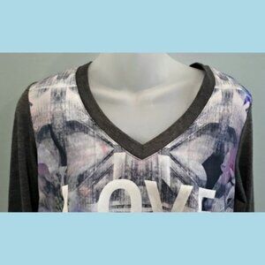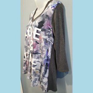 3/$20 BOBEAU Love & Peace Quote Abstract Graphic Top Cropped 3/4 Sleeve Gray