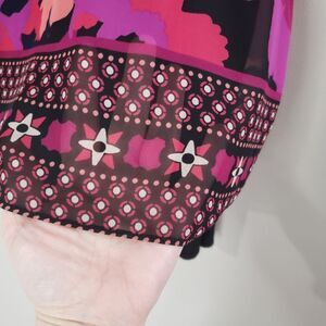 This Dana Buchman blouse features a relaxed, boxy fit with a vibrant mix of pink and purple hues. The short sleeves and lightweight fabric make it perfect for a breezy, comfortable wear. Its unique geometric border pattern adds a stylish touch to this elegant top.