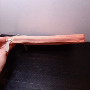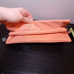 A compact travel purse in a beachy shade of orange. From clutch to wristlet, the inner compartments are ideal for organization. It comes with a detachable, adjustable strap to convert it to a crossbody or shoulder bag. Complete with a zip closures and silvertone hardware, this bag is ready to go.