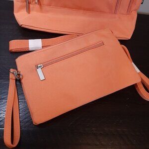 Also included is a wristlet clutch in a coordinating cantaloupe orange.