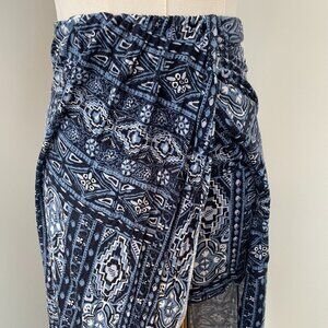 Details: Stretchy, patterned, high-waisted, wrap-style skirt with a slit up the front. Elastic waistband and stretchy fabric for a comfortable, sleek fit. Inner layer is a mini skirt with an outer layer that drapes down the back and sides. Can be pulled up over the bust to be worn as a high-low top or beach cover up.
